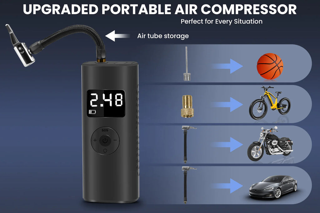 Portable Design: It can be easily put into a car, bike rack, or backpack and is very suitable for inflating during travel or at home. The cordless tire inflator includes multiple accessories and is a must-have product for drivers, cyclists, and adventurers.