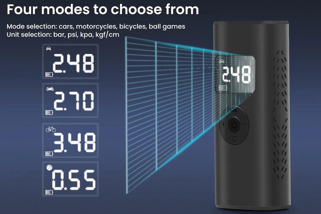 4 Inflation Modes: The air compressor has four types of pressure units: PSI, KPA, BAR, and KG/CM². There are four preset inflation modes: bicycle, motorcycle, car, and ball. It is an essential product for daily life and travel.
