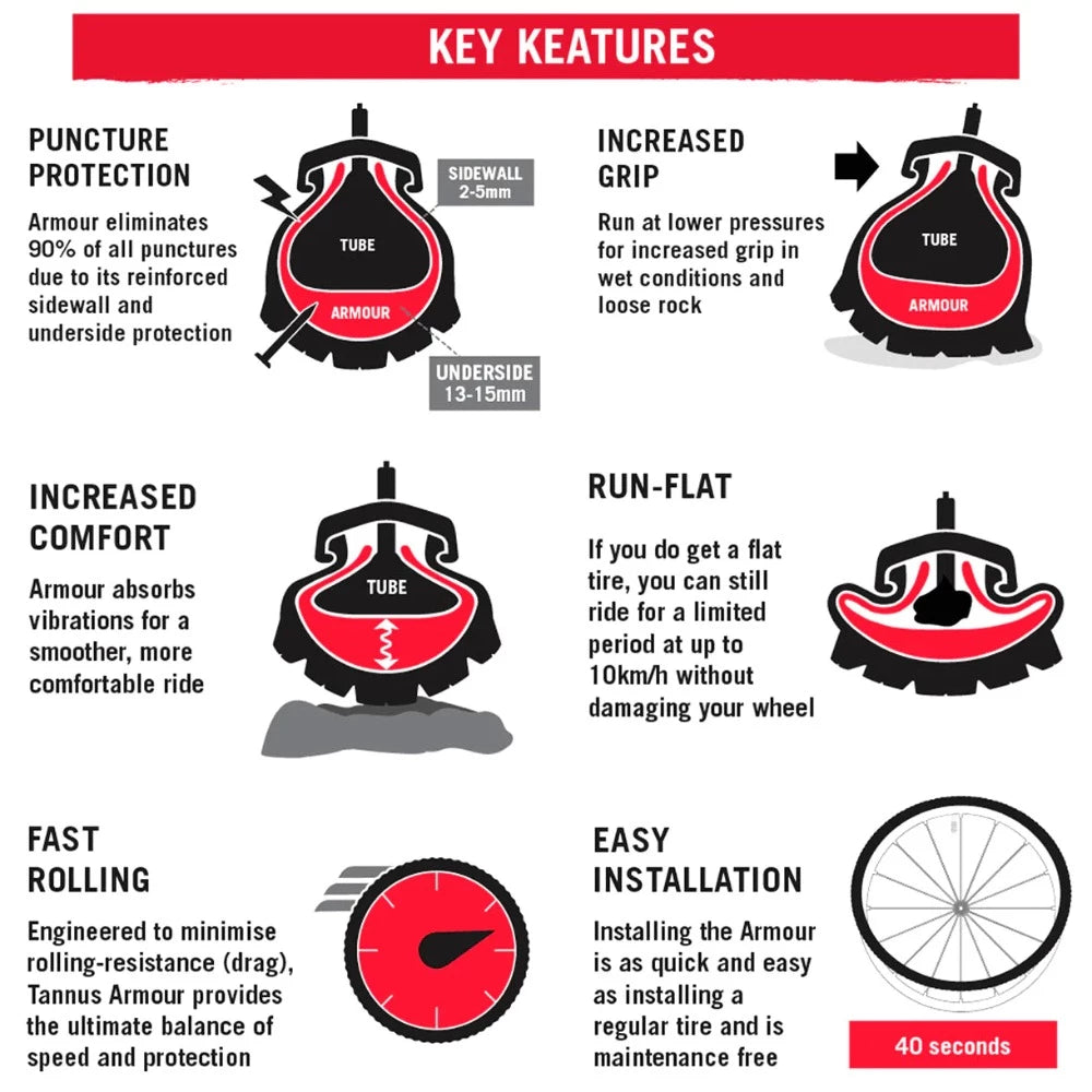 Sitting between your tire and inner tube, the Tannus Armour provides 15mm of puncture protection on the top, as well as 2mm of sidewall protection from sharp objects and rocks while adding vibration dampening for a smoother ride.