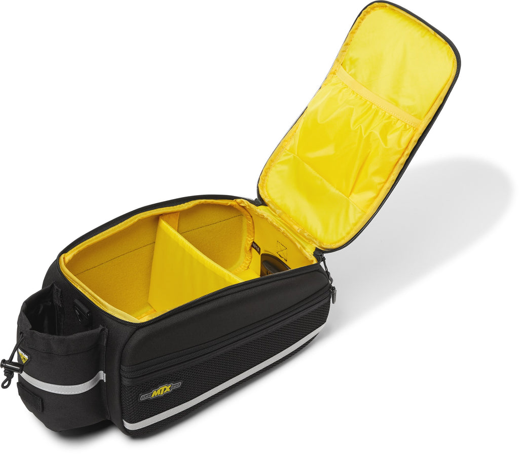 - Features divided main compartment and 2 mesh side compartments for extra capacity