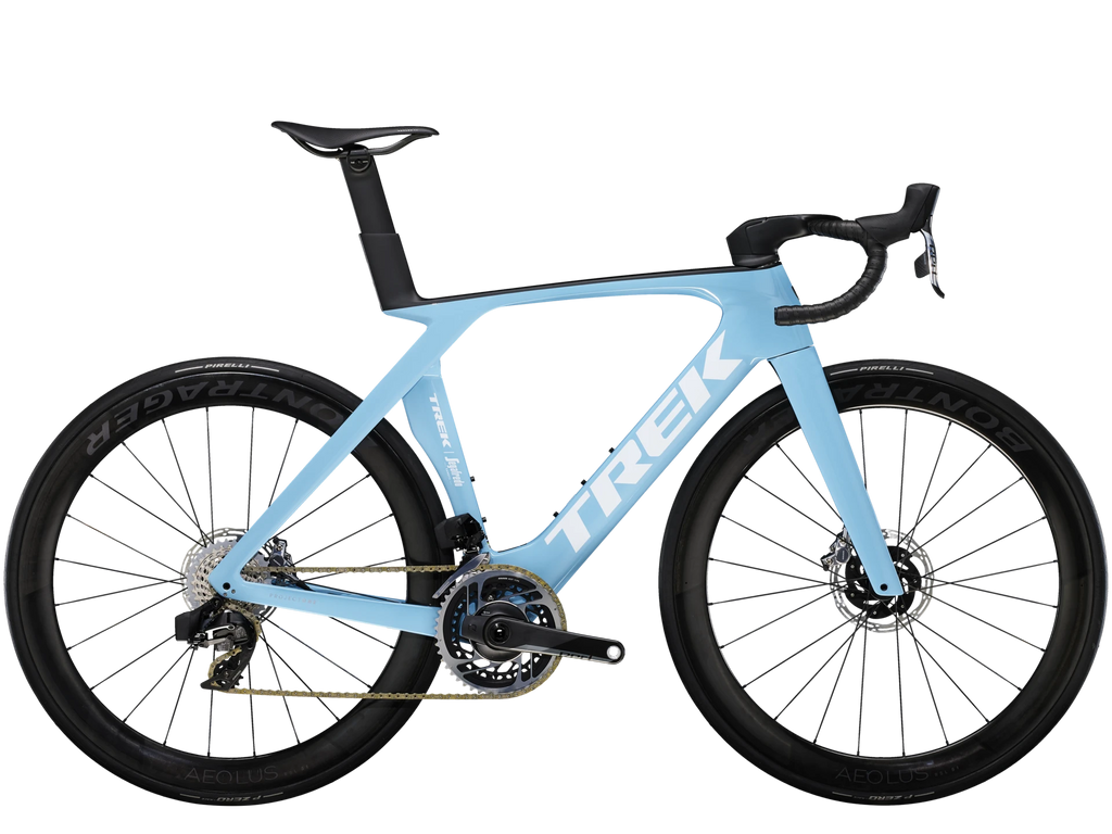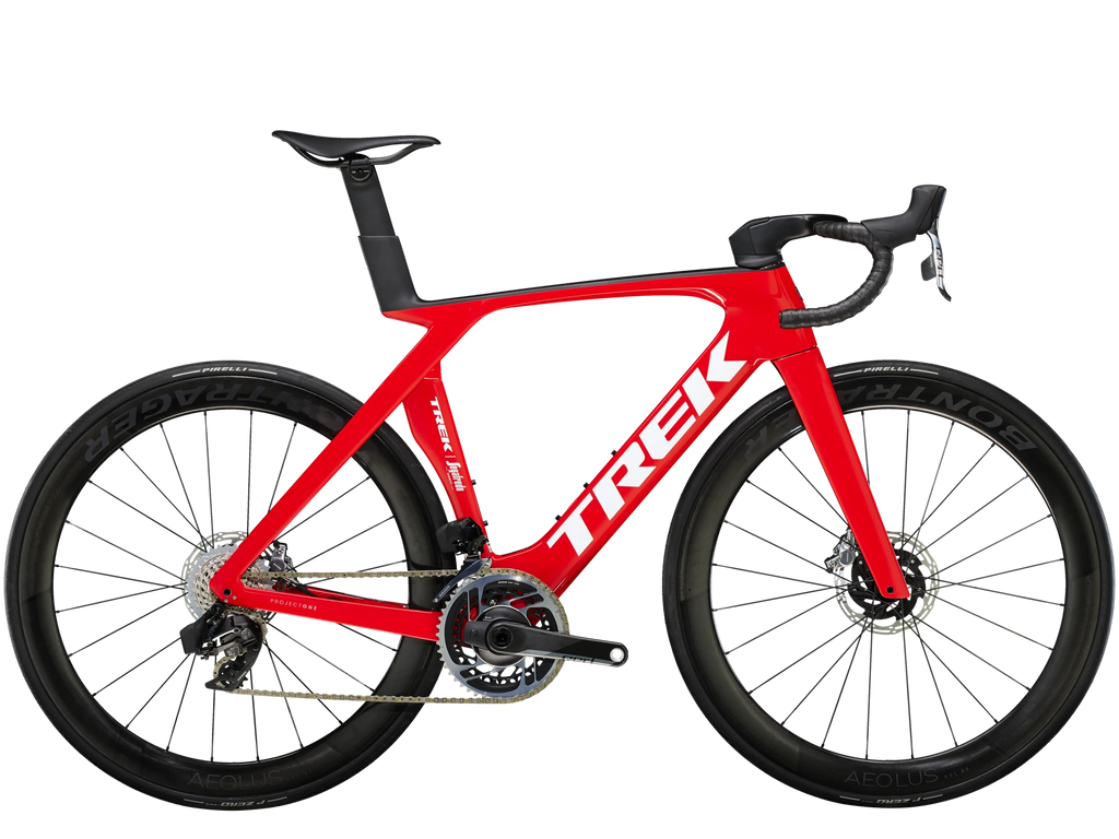 Madone SLR 9 AXS is ultralight, insanely fast, and super smooth. It's the ride you reach for on race day when every watt counts and your eyes are on the top step. This road race bike is built with an 800 Series OCLV Carbon frame and new IsoFlow technology that adds an aerodynamic advantage, cuts weight, and smooths the road ahead. As an official Trek-Segafredo race team replica bike, it's built from the ground up with cream of the crop components, like a SRAM RED AXS wireless drivetrain with a power meter and carbon wheels with a deep rim for even more aerodynamic gains.